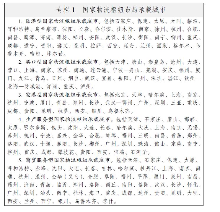 《规划》规定了国家物流枢纽的6种类型,包括陆港型、港口型、空港型、生产服务型、商贸服务型和陆上边境口岸型。结合“十纵十横”交通运输通道和国内物流大通道基本格局,选择127个具备一定基础条件的城市作为国家物流枢纽承载城市,规划建设212个国家物流枢纽,包括石家庄、保定等41个陆港型,天津、唐山等30个港口型,北京、天津等23个空港型,杭州、宁波等47个生产服务型,上海、南京等55个商贸服务型和黑河、丹东等16个陆上边境口岸型国家物流枢纽。