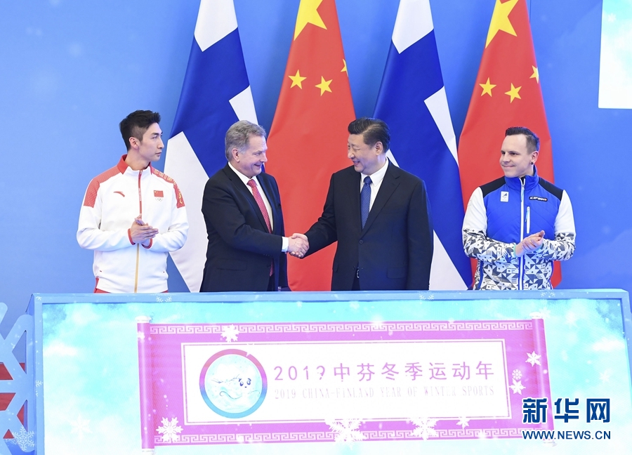 1月14日,国家主席习近平同芬兰总统尼尼斯托在北京共同出席“2019中芬冬季运动年”启动仪式。(图片来源:新华社 申宏摄)