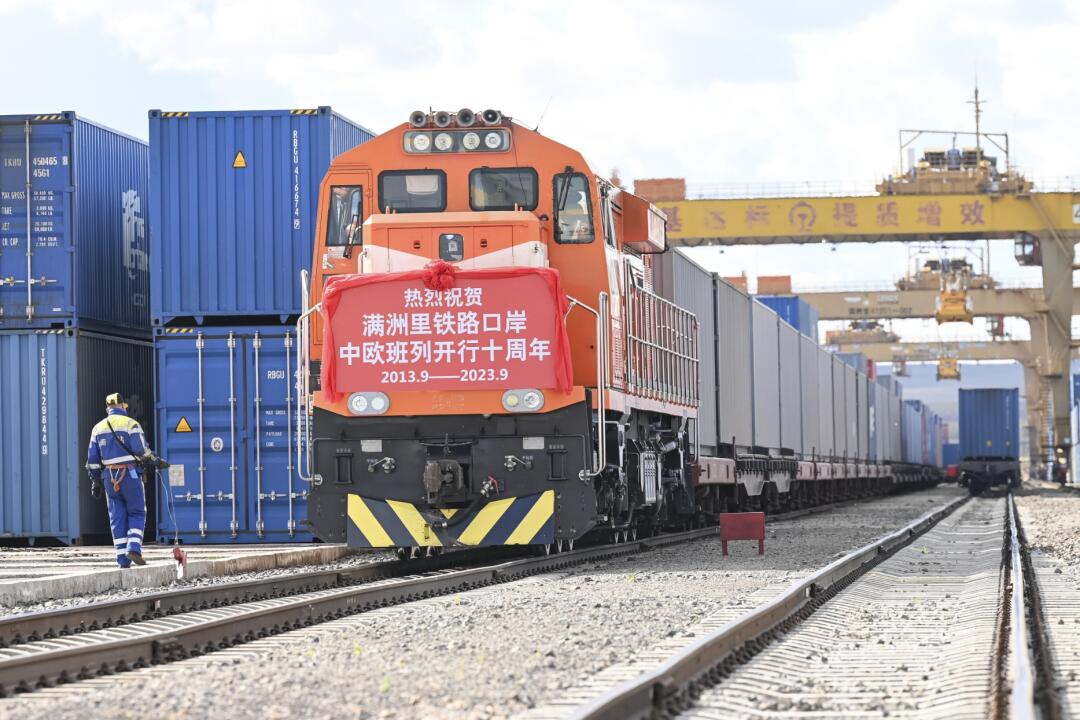 2023年9月30日,满洲里站迎来中欧班列开行十周年。十年来,中欧班列累计通行2.2万列,运送货物212万标箱,约占全国口岸通行量的三成。中欧班列的安全稳定畅通运行,开创了亚欧国际运输新格局,有力保障了国际产业链供应链稳定。